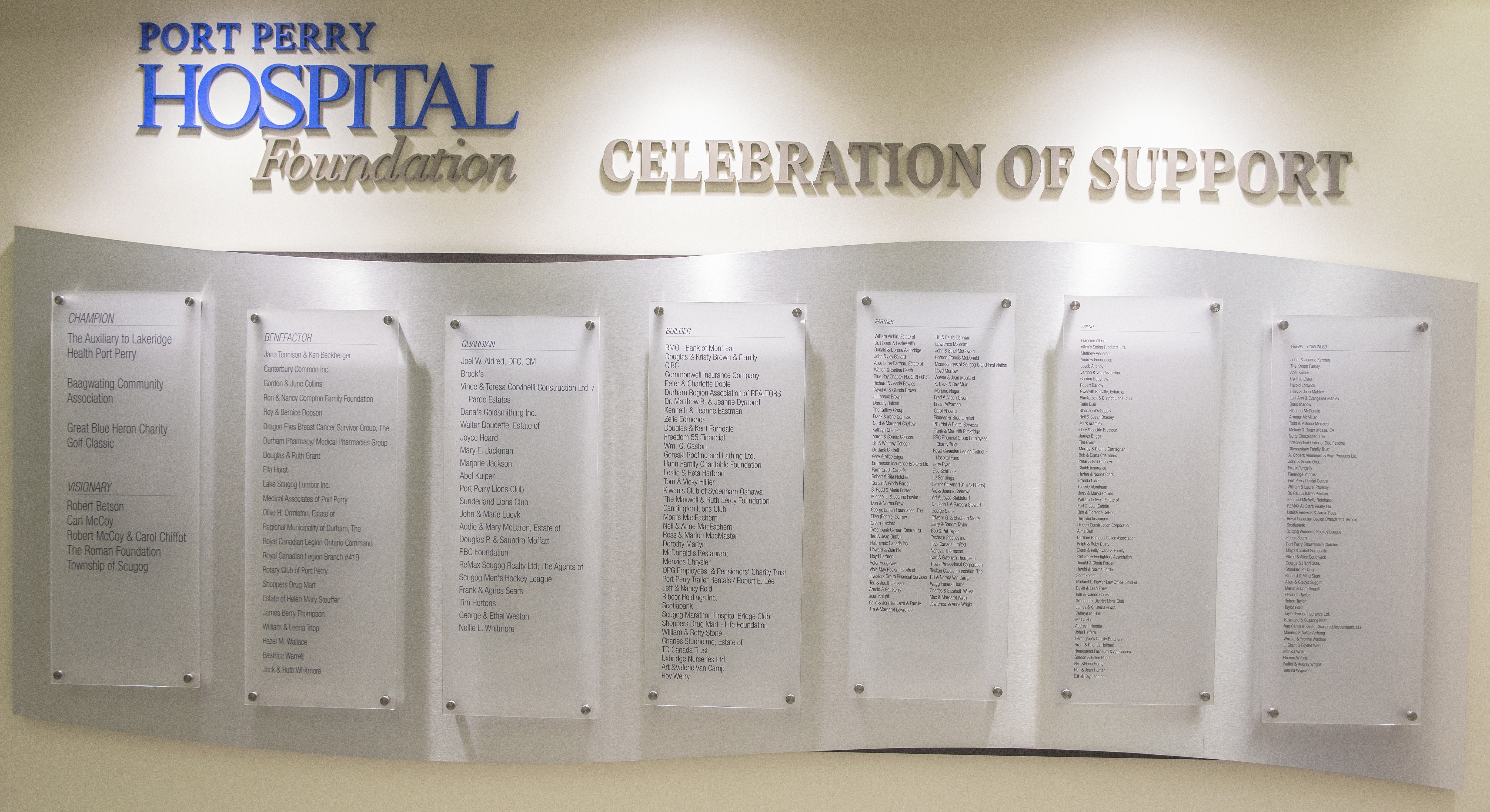 Our new main Donor Wall, unveiled August 2018, resides in the lobby of Port Perry Hospital. The Wall recognizes the many patients, organizations, community groups, friends and families who have supported Port Perry Hospital through their donations.